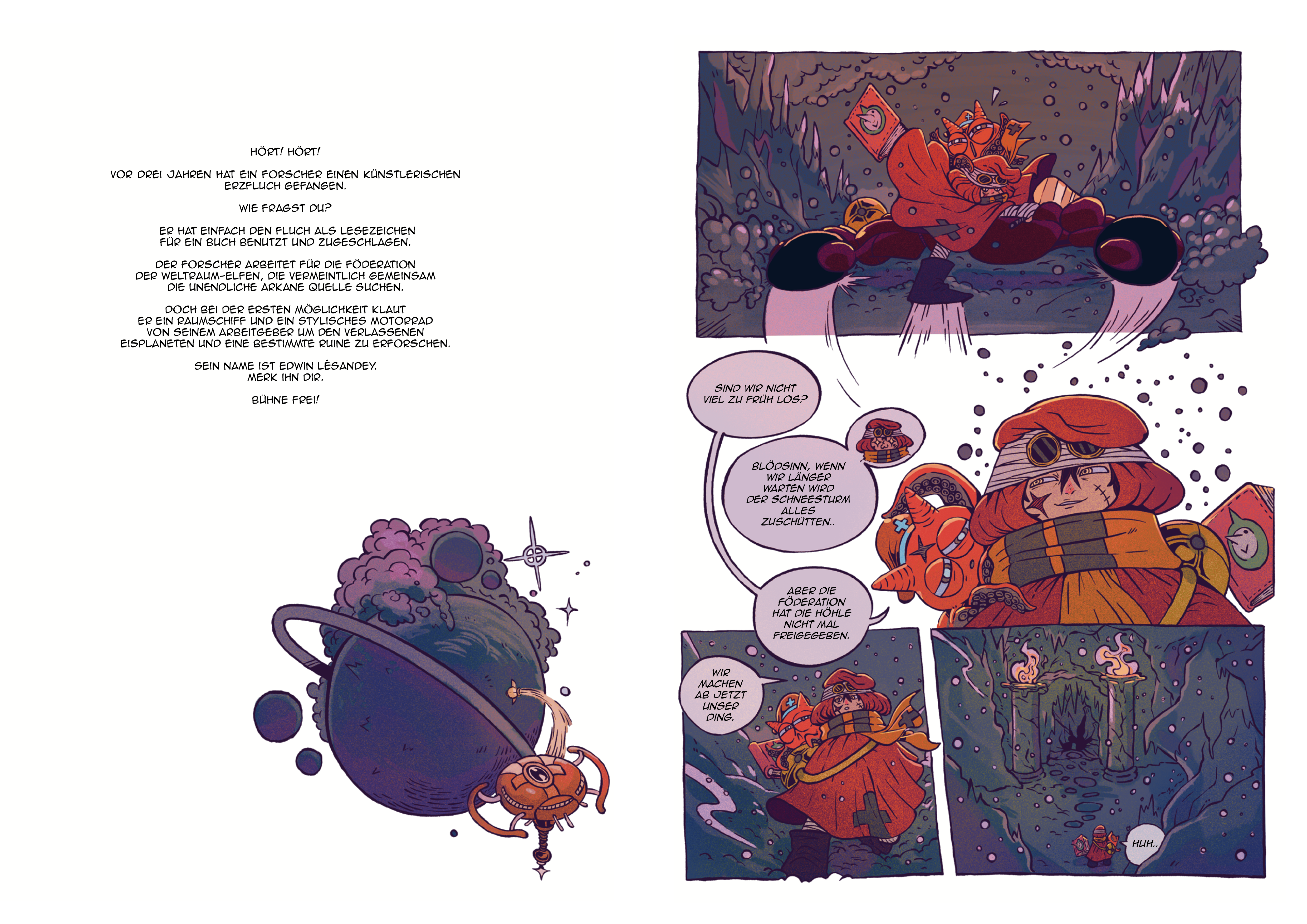 Ein kleiner Forscher spaltet sich ab von einer ominösen Weltraum Federation. Er sprintet auf einen Eisplaneten, um die starken Indizien auf einen Erzfluch zu untersuchen.